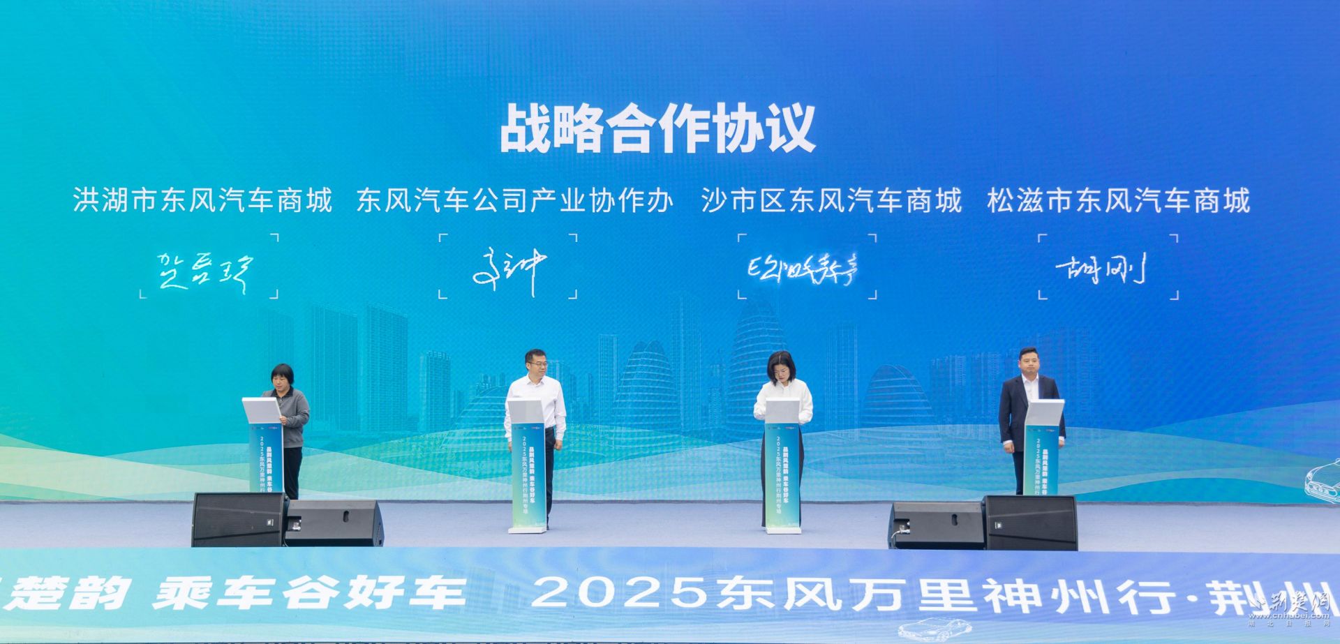 活動現(xiàn)場,神龍汽車與荊州市當(dāng)?shù)?家駕校簽訂100臺駕考駕培車購車協(xié)議,東風(fēng)汽車公司產(chǎn)業(yè)協(xié)作辦公室與荊州市機(jī)關(guān)事務(wù)服務(wù)中心簽訂戰(zhàn)略合作協(xié)議,東風(fēng)汽車公司產(chǎn)業(yè)協(xié)作辦公室與荊州市沙市區(qū)、洪湖市、松滋市三家東風(fēng)汽車商城簽訂戰(zhàn)略合作協(xié)議。