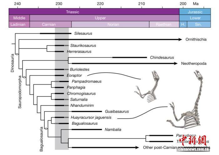 該論文介紹,晚三疊世(約2.37億-2.01億年前)的生態(tài)系統(tǒng)發(fā)生了急劇變化,導致恐龍、哺乳動物的早期近親以及包括鱷魚在內(nèi)的動物種群崛起和分化??铸堅缙谘莼脑S多證據(jù)都發(fā)現(xiàn)于南美,大部分關鍵發(fā)現(xiàn)局限于阿根廷和巴西的兩個盆地地區(qū)。