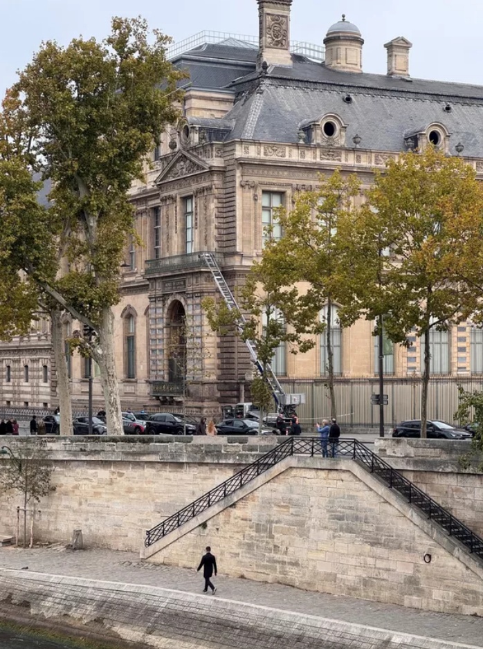 法國媒體《巴黎人報》援引其掌握的消息報道,嫌犯共有四人,其中兩人身穿工人裝及黃色反光背心偽裝成施工人員,乘升降吊籃進入博物館;另外兩人各自駕駛摩托車接應。警方在現(xiàn)場發(fā)現(xiàn)了兩臺切割機、一具噴燈、一些汽油、手套、一部對講機以及一條毯子。嫌犯疑似從塞納河一側施工區(qū)進入建筑后,使用切割工具打開展廳玻璃,進入阿波羅畫廊盜走珠寶。