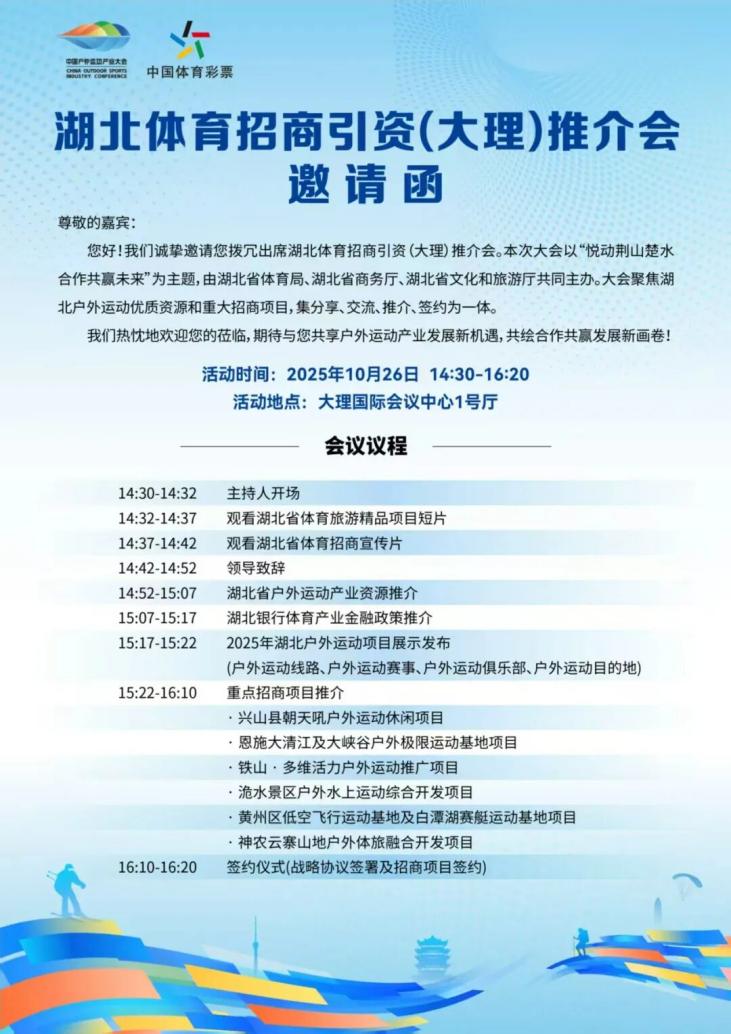 為貫徹體育產業(yè)高質量發(fā)展部署,釋放湖北戶外運動資源優(yōu)勢,搭建跨區(qū)域合作平臺,由湖北省體育局、湖北省商務廳、湖北省文化和旅游廳聯(lián)合主辦的2025中國戶外運動產業(yè)大會湖北專場推介活動,將于10月26日14:30-16:20在云南大理國際會議中心1號廳重磅舉行。