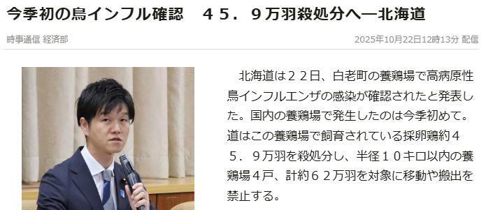 據(jù)報道,北海道政府決定對該養(yǎng)雞場飼養(yǎng)的約45.9萬只蛋雞實施撲殺,并禁止半徑10公里內(nèi)的4家養(yǎng)雞場(總計約62萬只)移動或外運畜禽。