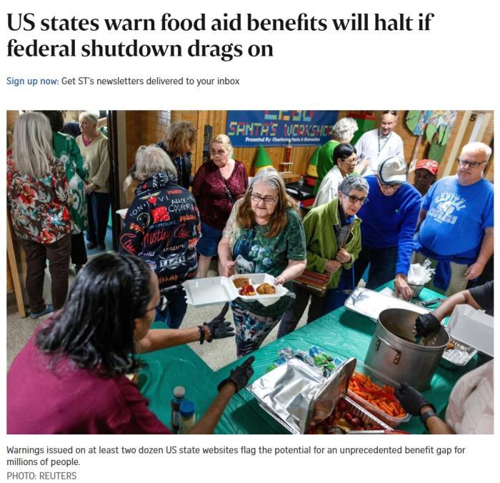 據(jù)美國廣播公司(ABC)報(bào)道稱,美國農(nóng)業(yè)部在一份通知中表示: “歸根結(jié)底,資金已經(jīng)枯竭。11月1日起將不會(huì)發(fā)放任何福利?!?/p>