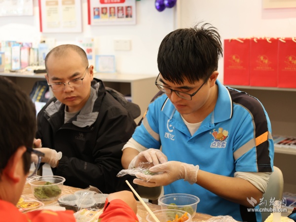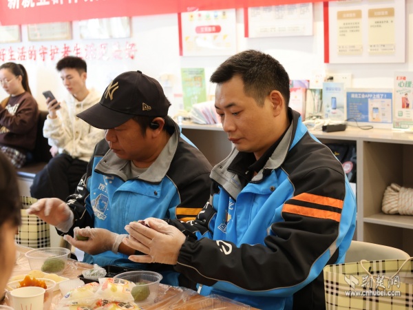 在制作青團時,現(xiàn)場同步開展“黃鶴家人茶話會”,搭建起代際對話的橋梁?;ǖ躺鐓^(qū)紫陽之星小區(qū)黨支部書記金文芳講述了小區(qū)變遷故事,傳遞長者對騎手們的關(guān)懷;新就業(yè)群體入黨積極分子樂倩倩則分享了送餐途中幫扶孤寡老人的暖心經(jīng)歷。兩代人的真誠交流深化了情感共鳴,現(xiàn)場洋溢著家人般的溫暖氛圍。