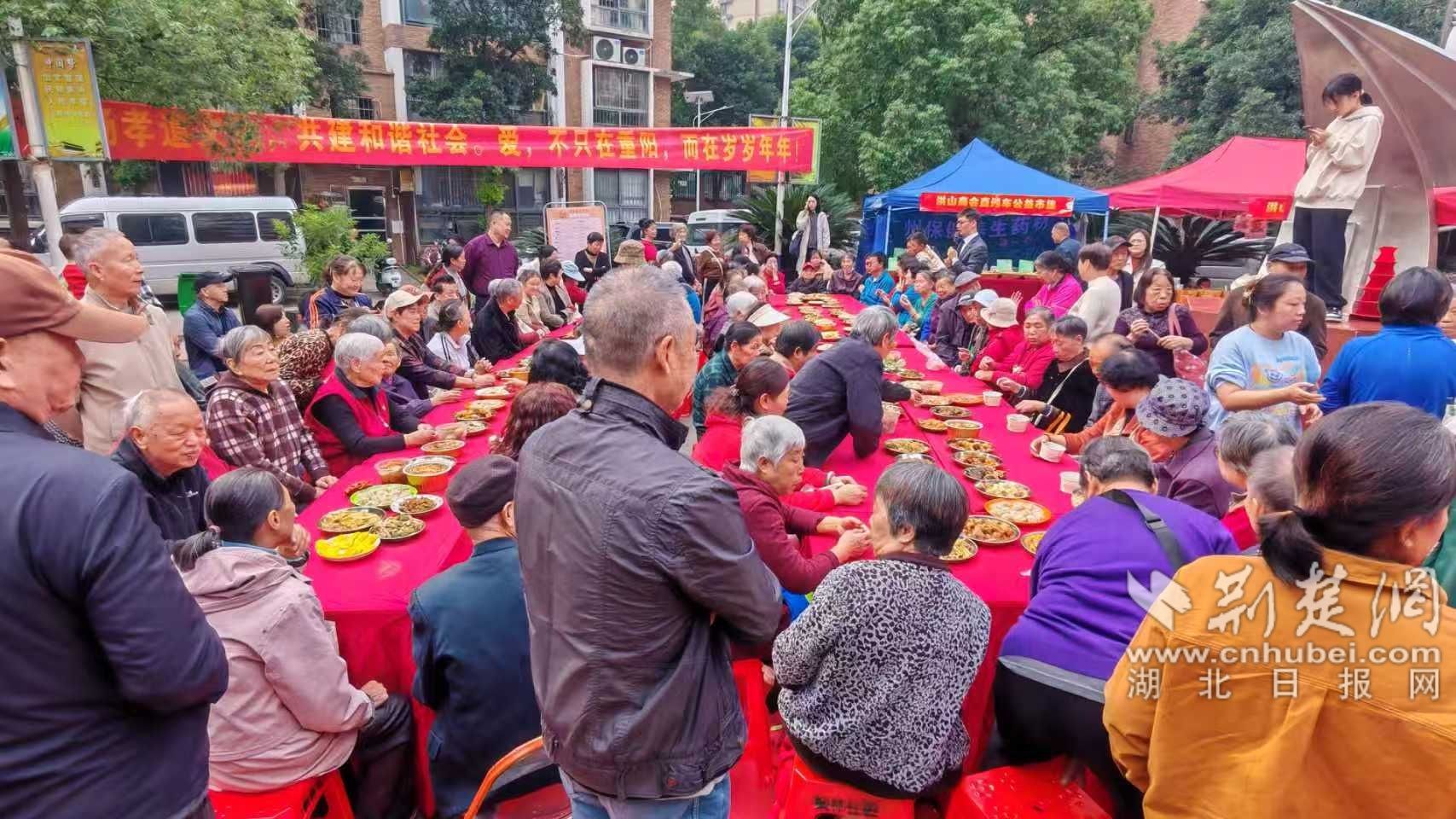 匯演落幕,備受期待的百家宴正式開席。社區(qū)精心籌備的100余道佳肴擺滿餐桌,葷素搭配合理、營養(yǎng)均衡豐富,既有軟糯香甜的傳統(tǒng)糕點(diǎn),也有鮮香入味的熱菜小炒,更有清爽解膩的時令瓜果,香氣撲鼻惹人垂涎。老人們圍坐一堂,邊細(xì)品美食邊拉家常、話趣事,鄰里間你謙我讓、其樂融融,一幅“社區(qū)一家親”的溫馨畫卷。黨員志愿者們穿梭席間,主動為行動不便的老人添菜倒湯,貼心詢問飲食偏好與身體狀況,細(xì)致周到的服務(wù)讓現(xiàn)場暖意更濃、溫情倍增。