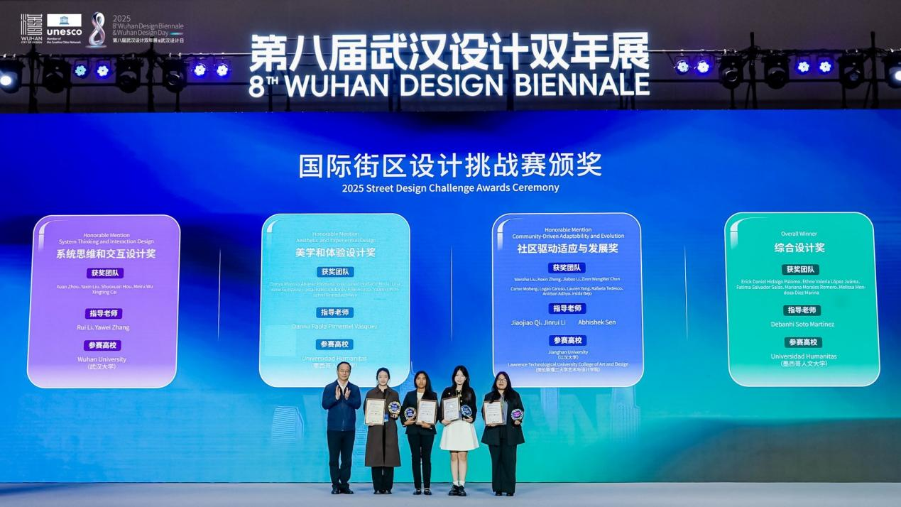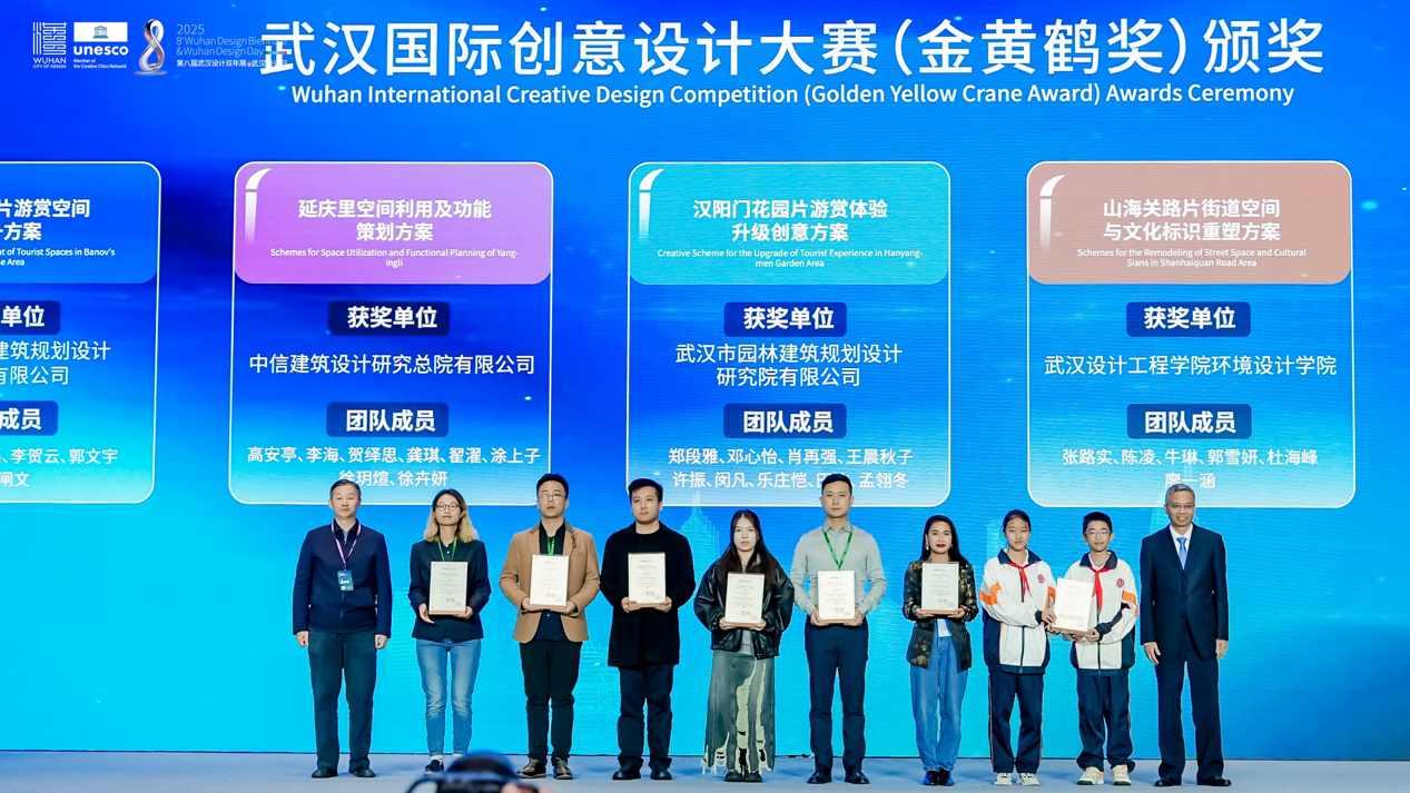 開幕式上,2025年武漢國際創(chuàng)意設計大賽(金黃鶴獎)與 2025年國際街區(qū)挑戰(zhàn)賽頒獎儀式同步舉行。其中,象征武漢設計創(chuàng)新探索的“金黃鶴獎”,今年特意選取黃鶴樓、山海關路、漢陽門等市民常去、關注度高、滿滿煙火氣的城市地標作為設計對象,不限專業(yè)和地域,征集更宜人的更新提升方案?,F場,武漢瑞拓建筑設計咨詢有限公司等6個專業(yè)組一等獎和最佳組織獎武漢市七一華源中學等獲獎代表接受頒獎。國際街區(qū)挑戰(zhàn)賽,則是由聯合國教科文組織設計之都城市聯合舉辦,全球高校團隊共同參與的國際設計賽事。經過全球30位權威專家1個月的精心細致評審,選出了四個優(yōu)勝方案。現場,為交互設計獎獲獎團隊武漢大學、美學設計獎獲獎團隊墨西哥人文大學、社區(qū)發(fā)展獎獲獎團隊江漢大學團隊和美國勞倫斯理工大學團隊,以及綜合設計獎獲獎團隊墨西哥人文大學頒獎。