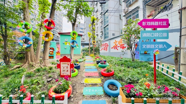 改造過程中,各方力量協(xié)同發(fā)力。物業(yè)負(fù)責(zé)大型樹木修剪,志愿者團(tuán)隊(duì)深入綠地清理雜草垃圾,累計(jì)清運(yùn)廢棄物數(shù)十袋;施工人員開展土地平整,精心栽種月季、杜鵑、迷迭香等適應(yīng)性強(qiáng)的觀賞植物,搭配彩繪輪胎裝飾,使綠化覆蓋率達(dá)到80%以上。最引人注目的是,花園創(chuàng)新融入消防主題元素——消防栓造型景觀、滅火器樣式指示牌等設(shè)施點(diǎn)綴其間,讓居民在休閑漫步中自然接受安全教育。