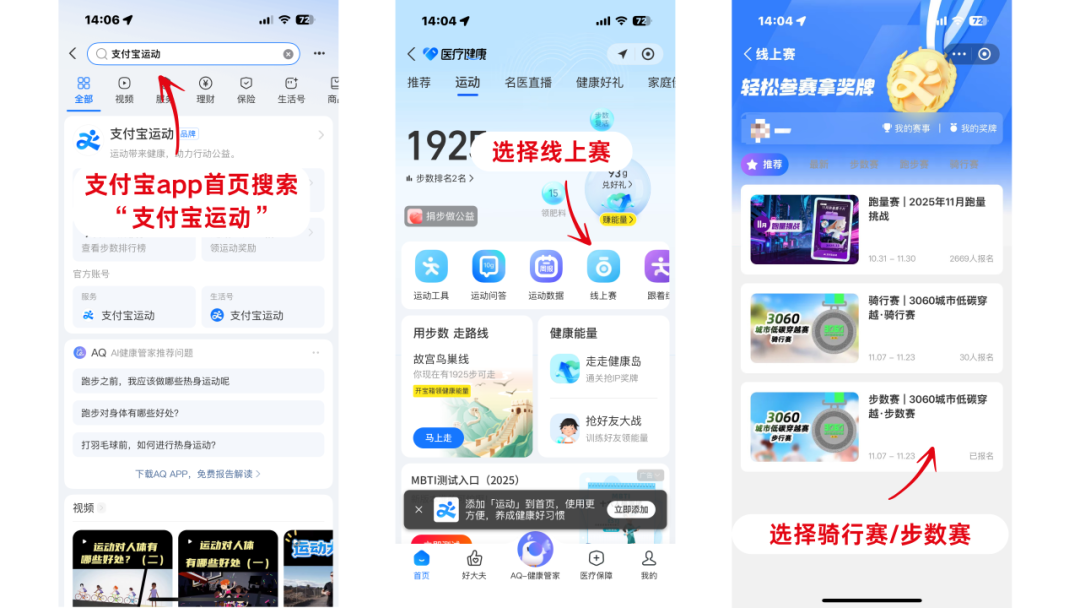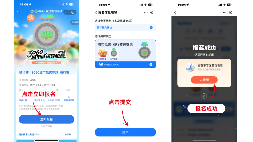通過支付寶APP,搜索“支付寶運(yùn)動(dòng)”小程序進(jìn)入“線上賽”專區(qū)報(bào)名參賽,或搜索“3060城市低碳穿越賽”小程序輪播頁跳轉(zhuǎn)報(bào)名。