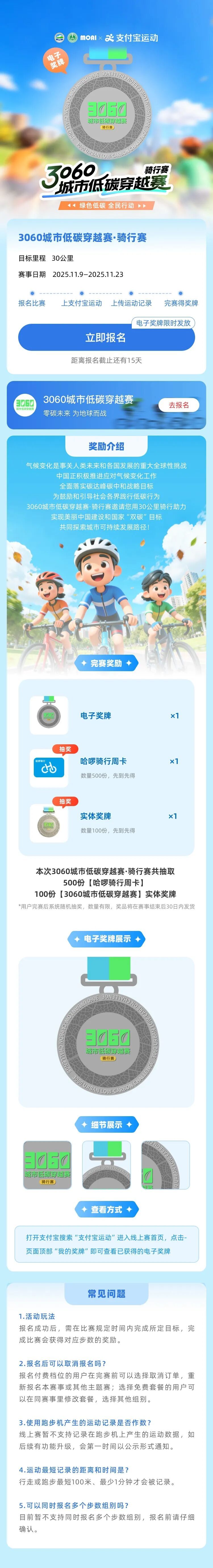 騎行賽:公眾報(bào)名參加線上騎行賽,授權(quán)并上傳距離記錄,在活動(dòng)時(shí)間內(nèi)累計(jì)騎行30公里即可完成比賽并獲得獎(jiǎng)勵(lì)。