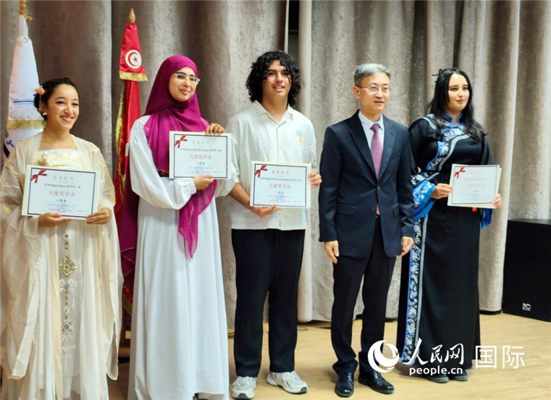中國駐突尼斯大使萬黎與部分獲獎?wù)吆嫌啊H嗣窬W(wǎng) 萊拉·阿提塔拉赫攝