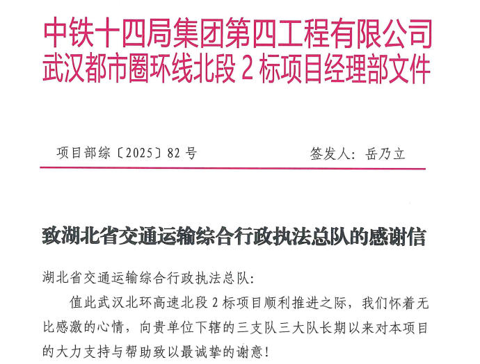 近日,湖北省交通運(yùn)輸綜合行政執(zhí)法總隊(duì)收到一封來自中鐵十四局集團(tuán)第四工程有限公司的感謝信。信中,武漢都市圈環(huán)線北段2標(biāo)項(xiàng)目部特意致謝總隊(duì)高速公路路政執(zhí)法三支隊(duì)三大隊(duì),稱贊其在項(xiàng)目施工審批、現(xiàn)場協(xié)調(diào)、交通疏導(dǎo)等關(guān)鍵環(huán)節(jié)的“全鏈條”靠前服務(wù),以專業(yè)高效的舉措為工程推進(jìn)掃清障礙,讓企業(yè)切實(shí)感受到服務(wù)速度與溫度。