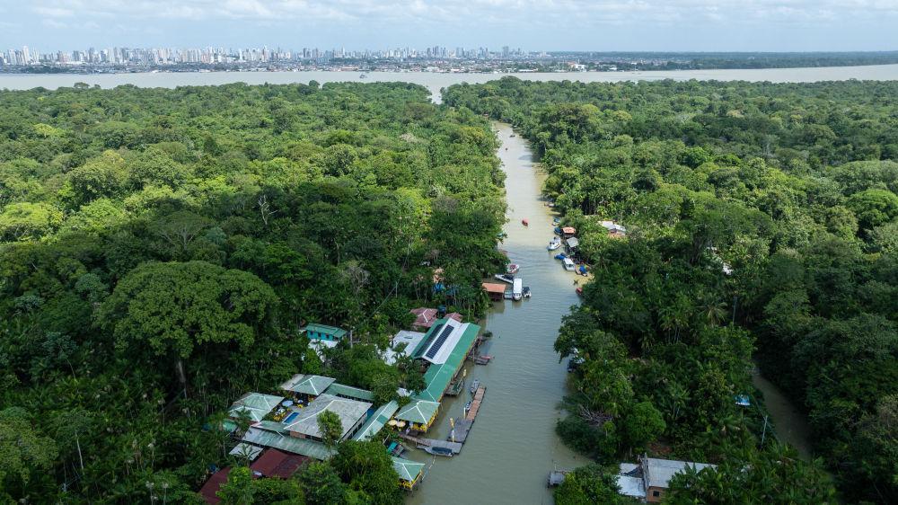 這是11月16日在巴西北部城市貝倫拍攝的熱帶雨林和河道(無人機照片)。新華社記者 王天聰 攝