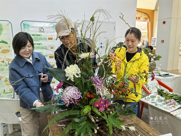 江岸區(qū)勞動街道公園社區(qū)園藝師韋勝(中)現(xiàn)場演示菊花插花技藝。通訊員供圖