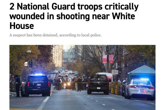 據(jù)警方官員稱,國(guó)民警衛(wèi)隊(duì)成員當(dāng)時(shí)正在執(zhí)行巡邏,突然遭到槍擊。警方還稱,現(xiàn)場(chǎng)已得到控制,涉嫌開槍者已被“制服”并被拘捕,但同時(shí)建議民眾避開該區(qū)域。