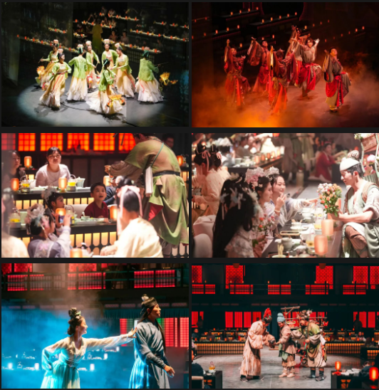 《清明上河·宋宴》沉浸式餐秀,以“活態(tài)宋式風(fēng)雅”為主題的全景沉浸式宴演,通過(guò)“宴席+演藝+科技”的創(chuàng)新形式,讓游客化身北宋汴京雅士,跟著宋代名人的腳步風(fēng)雅入宴。八幕十場(chǎng),演繹大宋生活美學(xué),從序章《菊盞流光》的茶香菊影,到終章《東京夢(mèng)華》的市井煙火,讓游客充分感受“食不厭精 膾不厭細(xì)”的宋式飲食哲學(xué)。