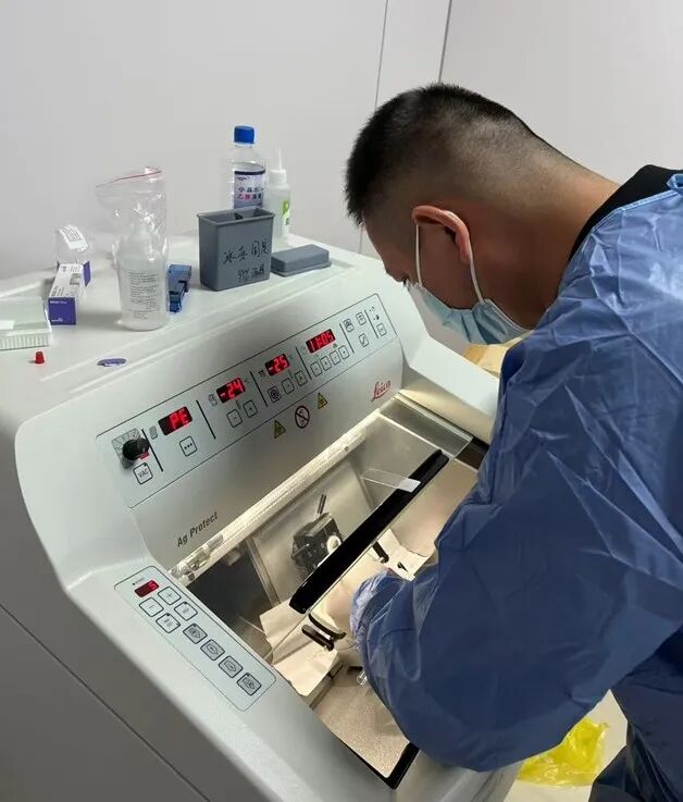 據(jù)悉,此次首例術(shù)中冰凍診斷的順利開展,源于病理科團(tuán)隊(duì)的提前統(tǒng)籌與精細(xì)化籌備。在接到東城院區(qū)手術(shù)快速預(yù)約需求后,科室第一時(shí)間啟動(dòng)協(xié)同機(jī)制:診斷醫(yī)師吳建山提前一天完成全流程預(yù)演,確保診斷環(huán)節(jié)無縫銜接;技術(shù)組李蓓、盧珂清晨到崗,對(duì)切片機(jī)、質(zhì)控試劑等關(guān)鍵設(shè)備進(jìn)行全面預(yù)熱與調(diào)試,為標(biāo)本處理的高效性和準(zhǔn)確性筑牢基礎(chǔ)。