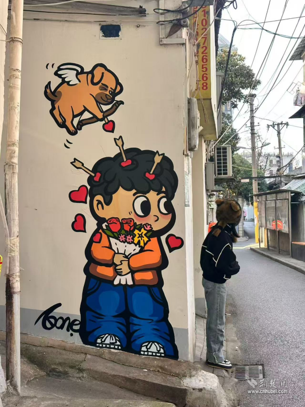 經(jīng)過藝術(shù)團隊改造,一幅幅創(chuàng)意彩繪在老墻上生動綻放:俏皮的丘比特小狗對藏身墻角手捧鮮花的小男孩發(fā)射愛心之箭,靈動的貓咪順著管道輕盈攀爬,街邊常見的管道被巧妙繪成卡通小車的排氣管……這些充滿巧思的設(shè)計,讓原本陳舊單調(diào)的墻面變成了居民家門口的“露天畫廊”,也為老街增添了別樣的生機與溫度。
