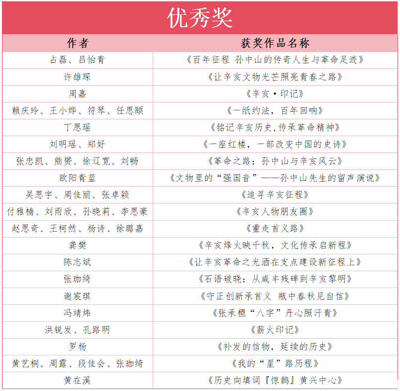 恭喜所有獲獎者!再次感謝所有參賽者的積極參與,我們相信,你們的熱忱與創(chuàng)意將推動辛亥革命精神在新時代廣闊征程中賡續(xù)傳承,期待未來每一位參賽者都能在文物保護與傳播的實踐中,繼續(xù)書寫屬于自己的精彩篇章!