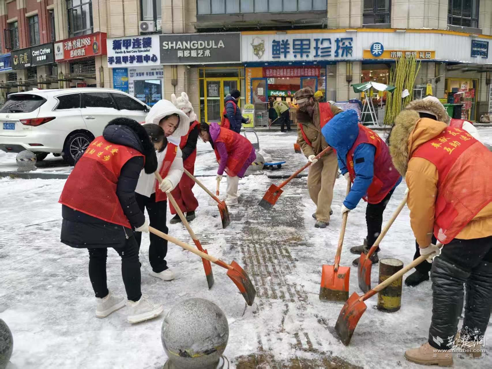 陳家墩社區(qū)則結(jié)合老舊小區(qū)多、坡道多的實(shí)際情況,提前明確分片包干責(zé)任,將單元門(mén)口、背街小巷和易結(jié)冰路段列為重點(diǎn)區(qū)域,組織街道工作人員與社區(qū)黨員志愿者、熱心居民并肩作戰(zhàn)。雪花落滿肩頭、化成水珠,大家卻顧不上拍一拍,鏟一鍬、掃一段、清一處,干勁十足?!翱吹铰访嫔戏e雪都清理干凈了,才放下心來(lái)。”