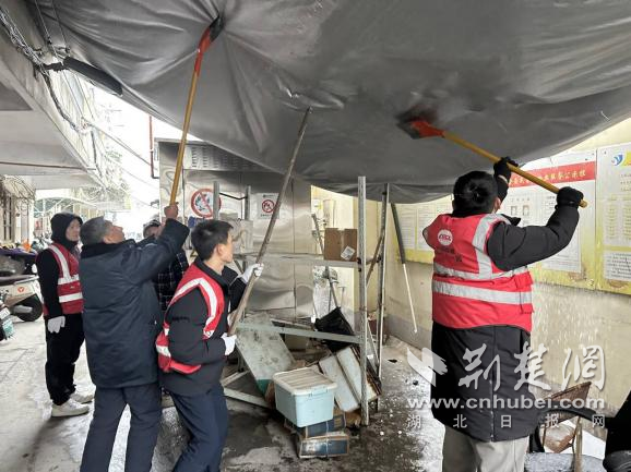 除雪過(guò)程中,工作人員發(fā)現(xiàn)一處老舊小區(qū)宿舍門(mén)前遮雨棚因積雪堆積嚴(yán)重變形,存在垮塌隱患。大家立即分工協(xié)作,有的手持長(zhǎng)桿清理棚頂積雪,有的在下方拉起警戒線、疏導(dǎo)居民通行,及時(shí)消除了高空墜物風(fēng)險(xiǎn),為居民撐起一把“安全傘”。