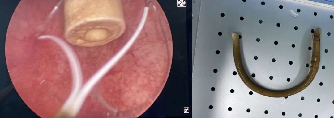 然而,在膀胱鏡檢查術中,醫(yī)生發(fā)現(xiàn)這根異物竟是半截被結石包裹的舊導尿管??紤]到激光破碎可能損傷膀胱黏膜,晏增亞當機立斷,決定調整手術方案。他與張佳晨醫(yī)生默契配合,利用簡易套索工具,精準套住異物一端,小心翼翼地調整角度,穩(wěn)步將這根潛藏多年的“陳年老物”完整取出。整個手術過程不到十分鐘,出血少、創(chuàng)傷小,既避免了器械破碎帶來的潛在損傷,又為患者大幅節(jié)約了治療費用。