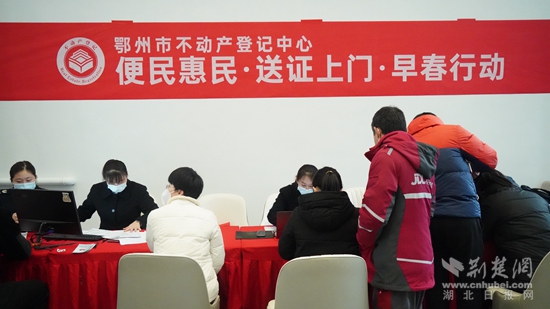 荊楚網(wǎng)(湖北日報(bào)網(wǎng))訊(通訊員 周婷)3月22日上午,鄂州市不動(dòng)產(chǎn)登記中心開展“便民惠民送證上門”活動(dòng),將辦證服務(wù)窗口延伸到楚天都市鑫園售樓部,現(xiàn)場接受購房群眾申請,現(xiàn)場受理,現(xiàn)場發(fā)證。