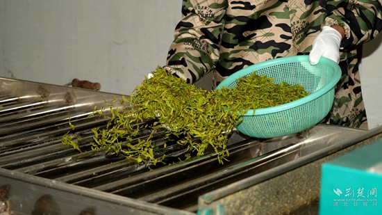 “我們現(xiàn)在是茶葉豐收期,所以我們生產車間都是24小時運轉,工人都是三班倒,確保每天能產干茶600多斤?!?蘄春蟹子地茶業(yè)有限公司總經理吳風長高興道。