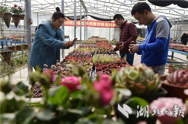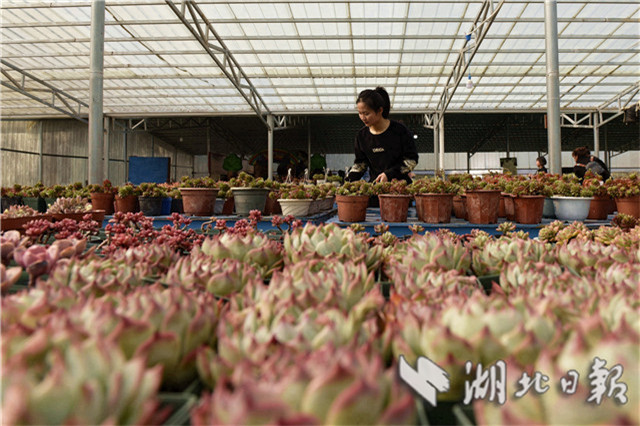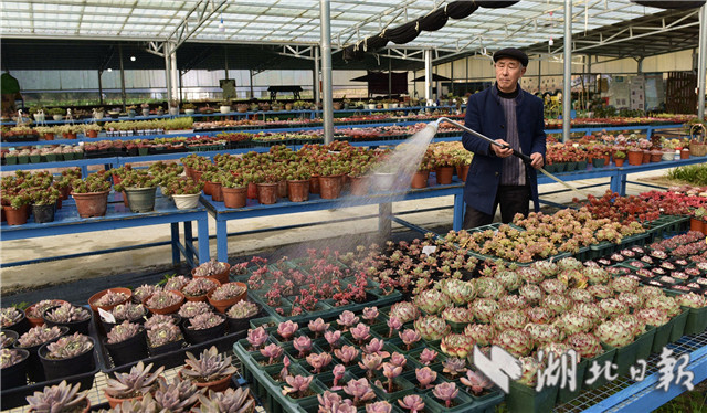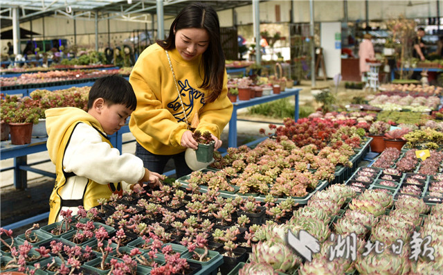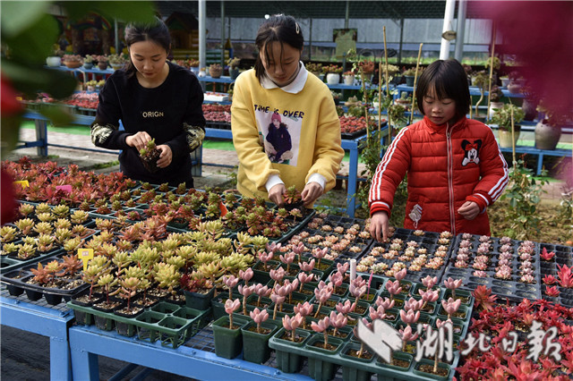 3月10日,在湖北省通城縣馬港鎮(zhèn)界上村東山大屋多肉植物種植大棚社員忙著移栽、管理、銷售多肉植物。連日來,湖北省通城縣馬港鎮(zhèn)界上村東山大屋多肉植物種植花卉大棚里春意盎然,五顏六色的多肉小盆栽連綿成花海,顏色豐富多彩,吸引游客拍照、購買,開展親子活動。