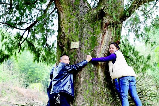 越往山里走,森林越茂密,古樹也越來多。在該村三組的一座老宅后,記者看到一片古樹群。最先映入眼簾的是一棵國家一級柏樹,上面布滿黑褐色紋理,樹干得幾人合圍。不遠(yuǎn)處,還有國家二級杉榔、二級柏樹等,整個山坡,就被大大小小幾十棵大樹遮蔽,其中被掛牌保護(hù)的就有8棵?!拔覀兇逵?1個自然村灣,每個灣子都有這樣的原始老林,而且很多都已被掛牌保護(hù),這是村里最大的財(cái)富。”村支書蔡世明說。他還給記者講了個故事,有一年,一家知名公司的人看上這里的樹,他們愿意出價三萬元,買走其中一棵,但村民們毫不心動,當(dāng)場就給拒絕了!