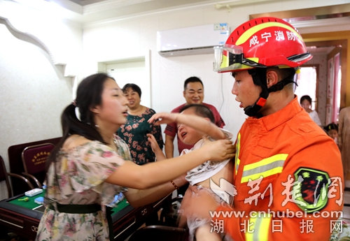 圖為消防員救出小孩現(xiàn)場?!≈鞚龜z