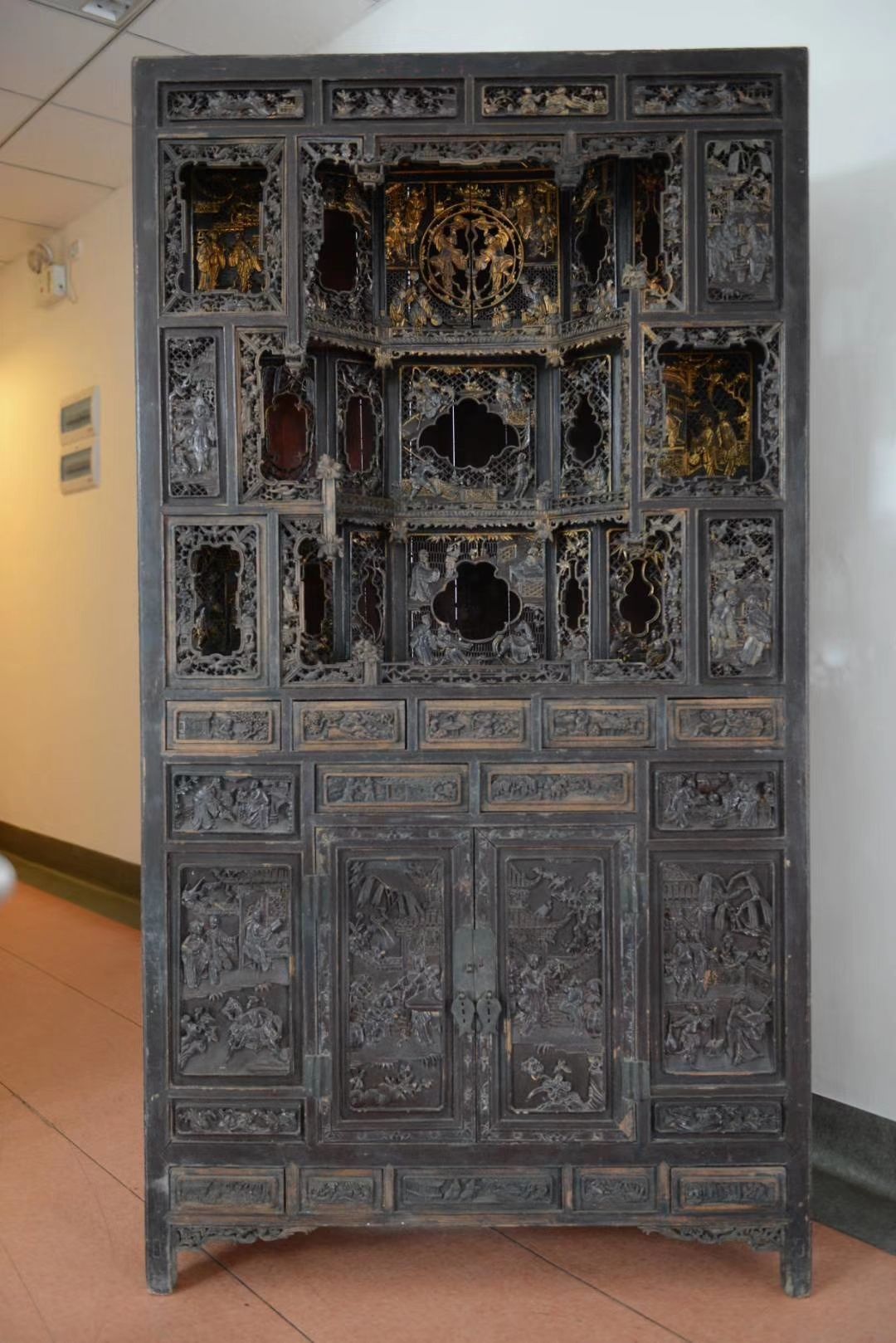這種盛行于明末清初的“看櫥”,既有實(shí)用性又有裝飾性,之所以稱之為“看櫥”,是因?yàn)樵诟?92 cm,寬104cm,深45.7cm的有限體積內(nèi),以不同的樓臺(tái)亭閣布局,雕飾86組神話人物、戲劇故事和花鳥圖案,做到繁而不亂,一目一景,景景相聯(lián),出神入化,讓人目不暇接,原件現(xiàn)存湖北省群眾藝術(shù)館。“看櫥”囊括了通山木雕的所有雕刻技法,代表著通山木雕的最高水平。成希和謝志兵(通山縣非物質(zhì)文化遺產(chǎn)保護(hù)中心主任)想復(fù)制它。