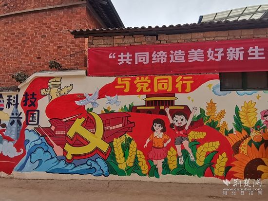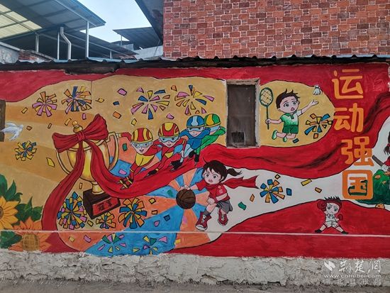 這面墻體上繪制了沐浴黨恩、運(yùn)動(dòng)強(qiáng)國(guó)、生態(tài)文明、科技興國(guó)、與黨同行、向黨向未來(lái)六大主題,其中既有充滿(mǎn)活力、朝氣和正能量的向日葵、麥穗、綠樹(shù)等植物,又有熊貓、猴子、兔子、獅子等可愛(ài)的動(dòng)物。