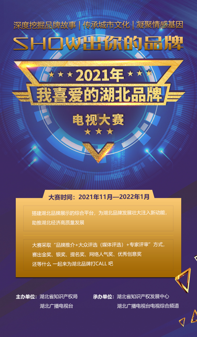 為推動湖北制造向湖北創(chuàng)造轉(zhuǎn)變,增強全省品牌意識,展示全省品牌成果,加快推進(jìn)品牌強省建設(shè),助力湖北經(jīng)濟(jì)社會高質(zhì)量發(fā)展。湖北省知識產(chǎn)權(quán)局與湖北廣播電視臺再度攜手,正式啟動2021年“我喜愛的湖北品牌”電視大獎賽。